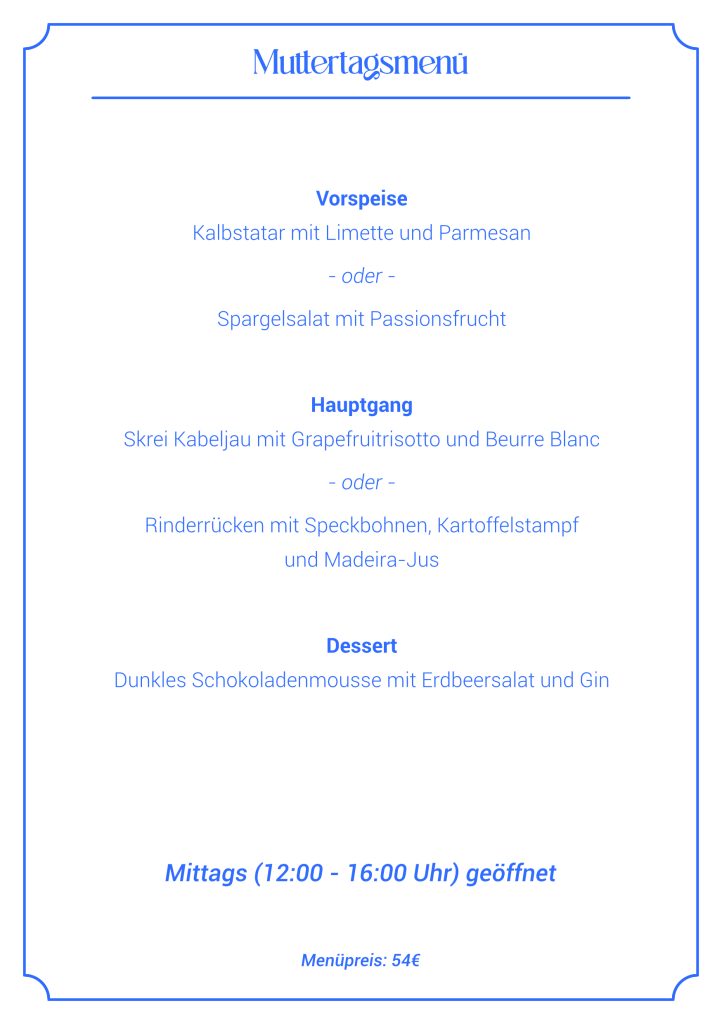 Am 10.Mai ist Muttertag, genießt einen wunderbaren Tag mit eurer Mama. Wir bieten euch dazu zwei entspannte 3Gänge Menüs an diesem Tag. Mittags und Abends geöffnet.